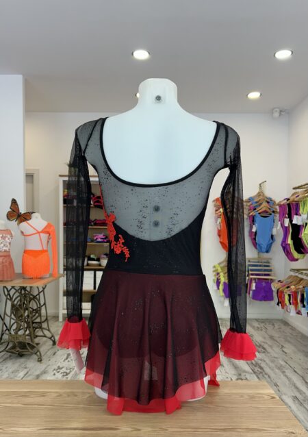 Maillot de purpurina negro con fondo turquesa brillante y falda doble.